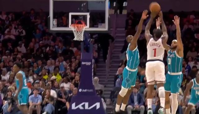 下半场开始,哈登基本上就得不到什么一对一单挑的机会,黄蜂对哈登的包夹更加坚决。但哈登来了手感,顶着两个人都会出手,还打成3+1,得分一路上涨。