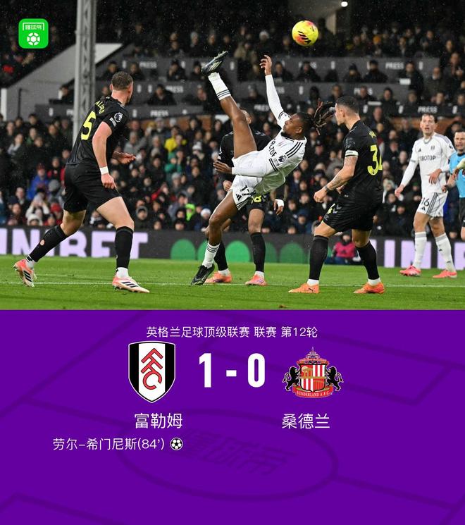 富勒姆1-0桑德兰,劳尔-希门尼斯一击制胜,丘库埃泽送助攻